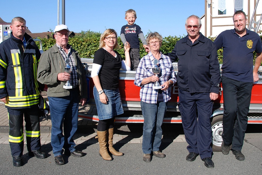 Pokalübergabe (Foto von links): Gruppenführer Martin Hesse, Theodor Hillebrecht, Simone Kube mit Sohn Benedikt, Helga Beverungen, Andreas Bohnenpoll sowie der stellv. Löschgruppenführer Andreas Klie