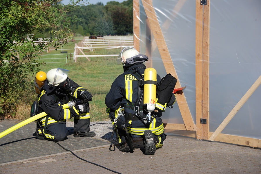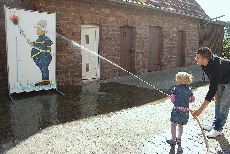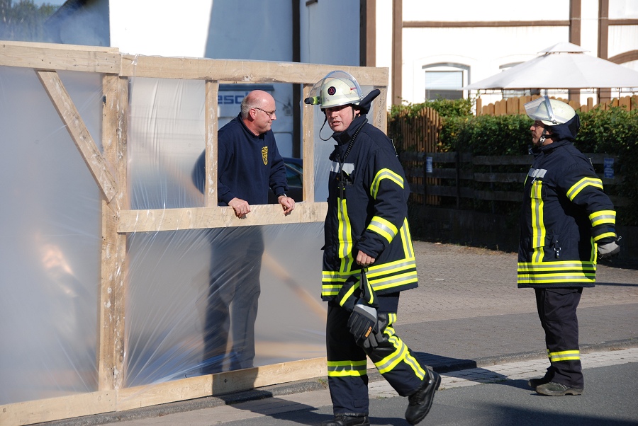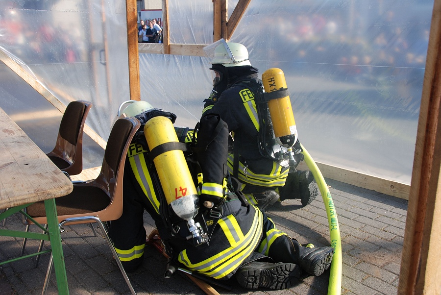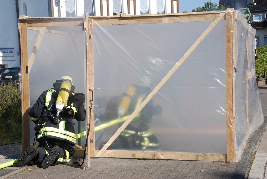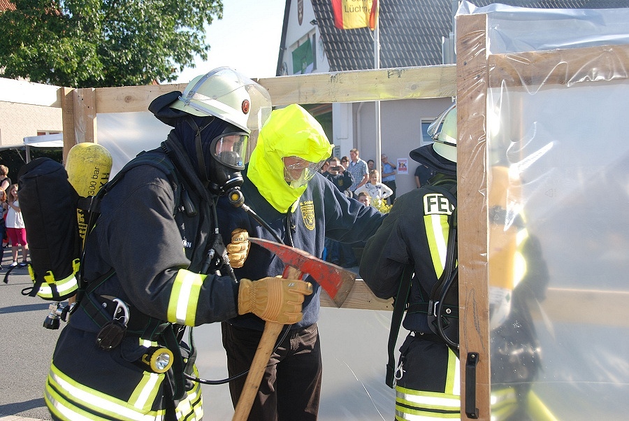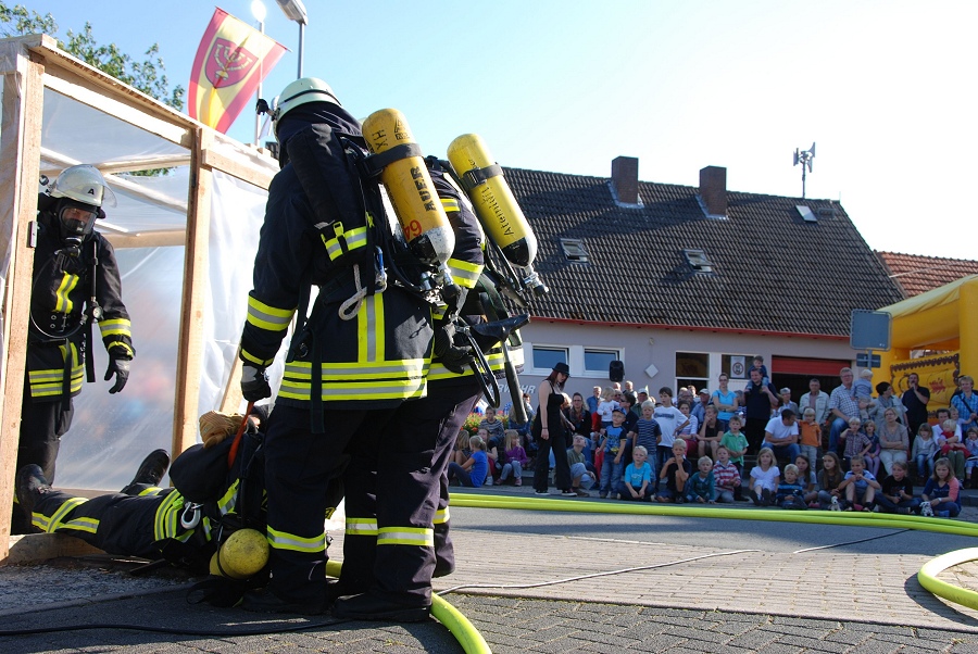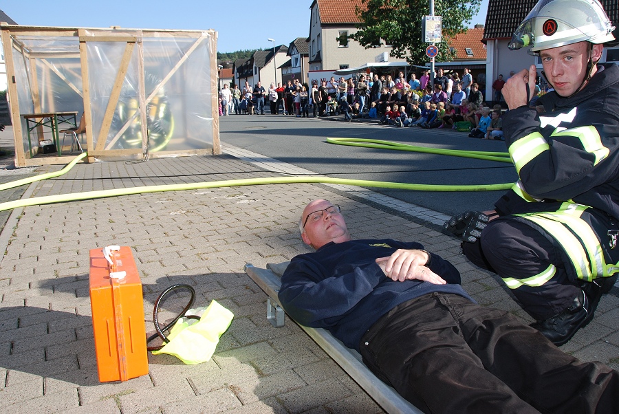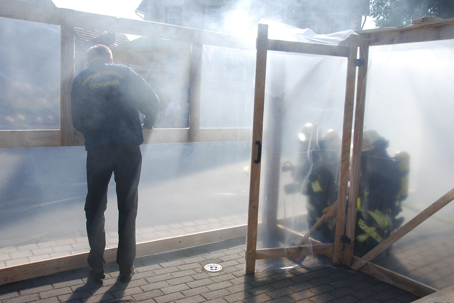Nachdem alle Wanderer wieder am Feuerwehrgerätehaus eingetroffen waren, demonstrierte die Löschgruppe Lüchtringen den Besuchern, wie die Feuerwehr bei einem Wohnungsbrand mit eingeschlossener Person vorgeht. Unter der Leitung von Gruppenführer Martin Hesse retten die Einsatzkräfte eine Person mit Hilfe einer Fluchthaube aus einem verrauchten Gebäude und löschten danach den Brand. Die Zuschauer konnten dabei alles hautnah bestaunen, weil das aufwendig gefertigte Brandhaus mit einer durchsichtigen Kunststofffolie verkleidet war. Auch Brandschutzerziehung war angesagt: An einem speziellen Telefon konnten Kinder das Absetzen eines Notrufes üben.