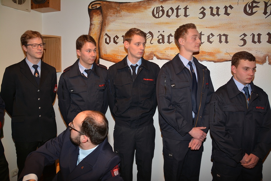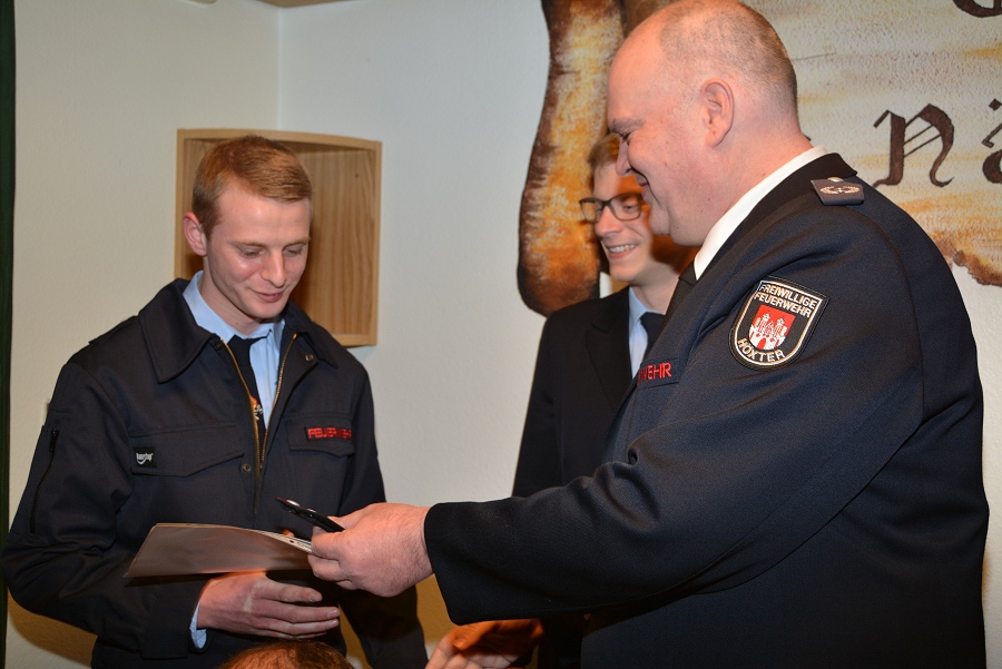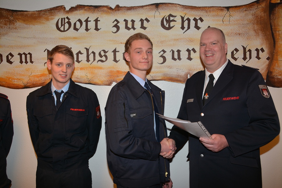 Beförderungen: Lukas Hoppe (zum Hauptfeuerwehrmann), Dennis Kossol, Marius Mönnekes und Lukas Sonderer (zu Feuerwehrmännern) sowie Tim Mönnekes zum Feuerwehrmann-Anwärter