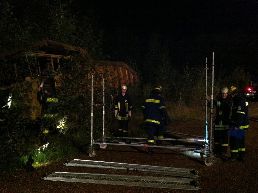 Lütmarsen/Wehrden / 15.09.2012 (TKu) Alarm für den THW Ortsverband Höxter und die Löschgruppe Lütmarsen: Nächtliche Explosion in einem Trafogebäude des Kieswerkes Wehrden, mehrere Personen gelten noch als vermisst. Dabei handelte es sich zum Glück nur um ein Übungsszenario, das von den Rettungskräften beider Organisationen fachmännisch und den Umständen entsprechend zügig in einer Nachtübung abgearbeitet wurde. Im Vordergrund dieser Übung stand neben der technischen auch die kameradschaftliche Zusammenarbeit der blauen und roten Helfer.