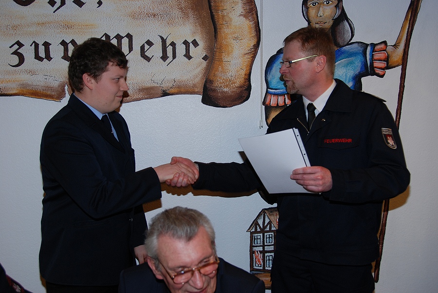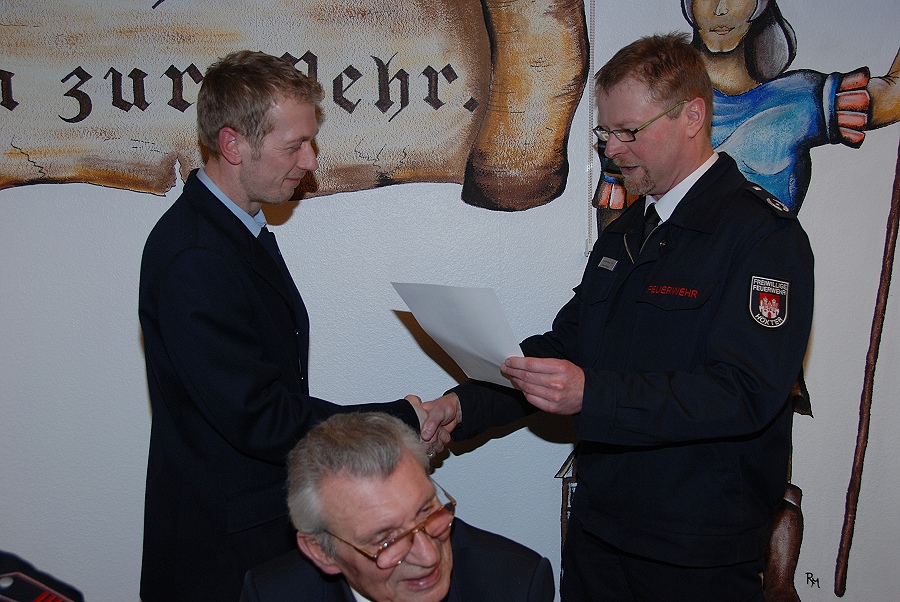 Dank und Anerkennung zollte auch die Ortschaftsratsvorsitzende Christiana Mönnekes den Kameraden der Feuerwehr Lütmarsen. Anschließend nahm der stellv. Wehrführer Norbert Rode Beförderungen und Ernennungen vor. Nach bestandenem Truppführer-Lehrgang in Brakel beförderte er Michael Köhne zum Unterbrandmeister. Als neuen Atemschutzgerätewart ernannte Rode den Unterbrandmeister Markus Kirchhoff nach bestandenem Lehrgang am Institut der Feuerwehr in Münster. Er übernimmt das Amt von seinem Vorgänger Thorsten Drüke, der zum Dank für seinen jahrelangen Einsatz als Atemschutzgerätewart mit einem Geschenk verabschiedet wurde. Zum Feuerwehr-Anwärter wurde Marius Heinrich ernannt. Des weiteren wurden die Neuwahlen für die Ämter im Feuerwehr-Förderverein durchgeführt. Der Vorstand setzt sich nach den Wahlen wie folgt zusammen: 1. Vorsitzender: Norbert Spieker, 2. Vorsitzender: Maik Multhaup, Kassenwartin: Andrea Kuhn, 2. Kassenwart: Stefan Steiner, Schriftwart: Stephen Kreimeier, 2. Schriftwart: Markus Kirchhoff.