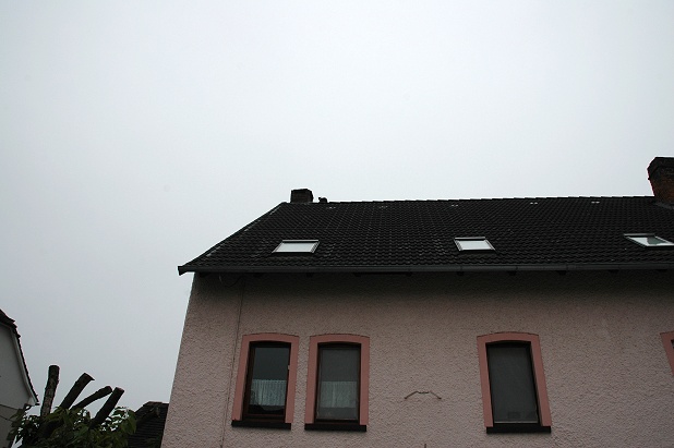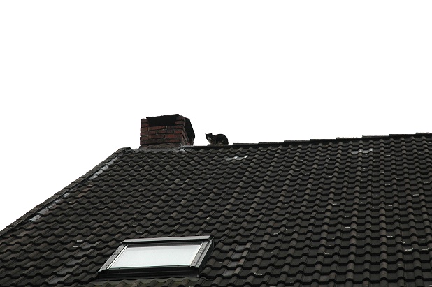 Katze sitzt auf dem Dachfirst eines Mehrfamilienhauses (Ortsfeuerwehr Boffzen mit dem LF8 vor Ort)