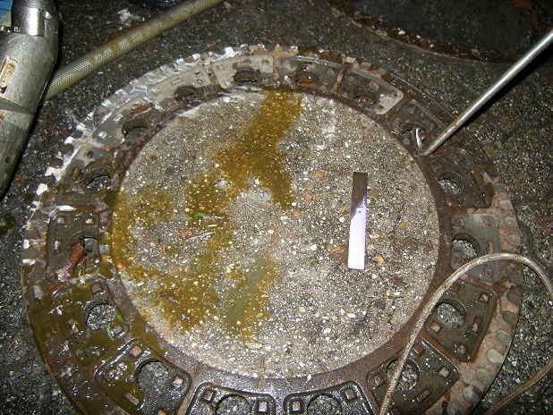 Starker Ölfilm auf dem Wasser im Schmutzwasserkanal, festgestellt durch eine Kanalreinigungsfirma