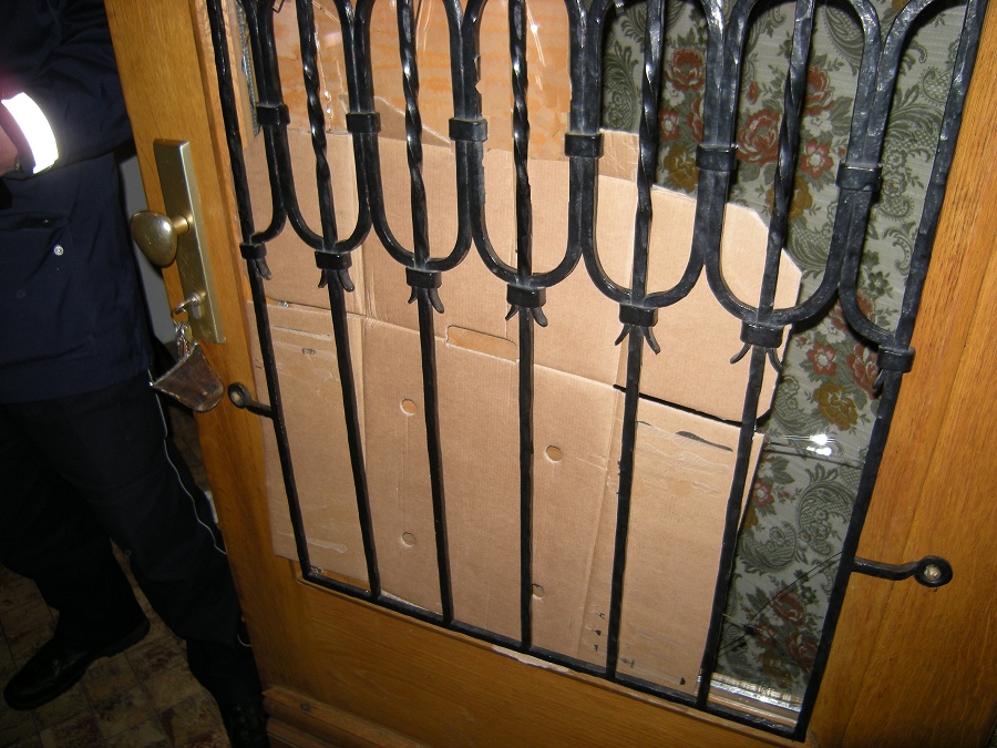 • Mittels Beil ein Loch in Türscheibe geschlagen