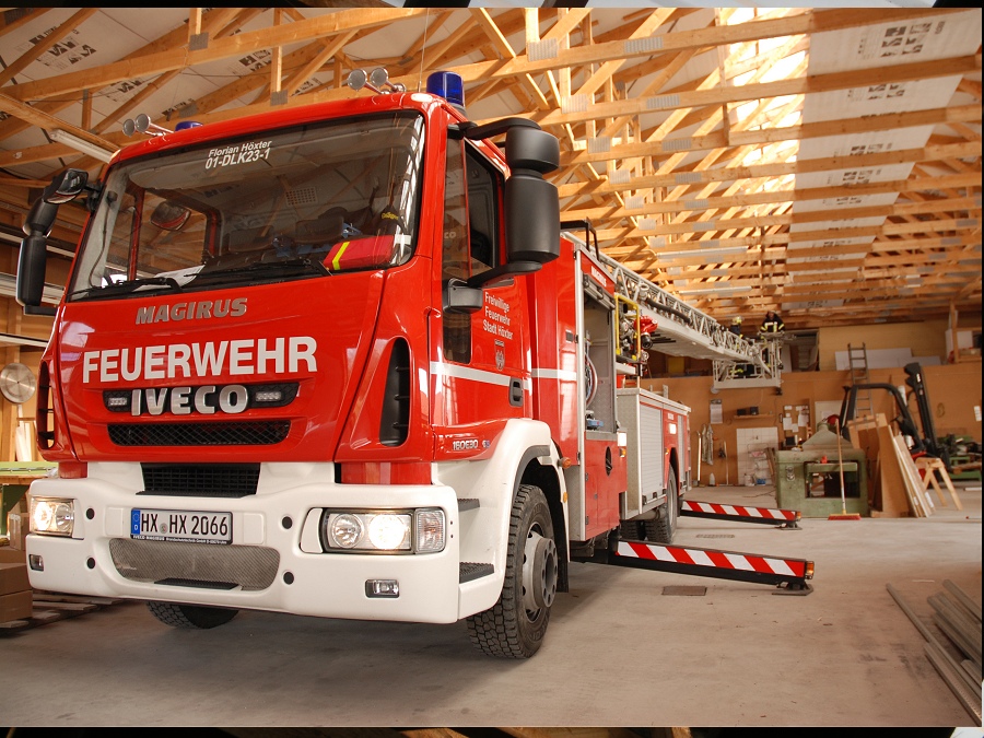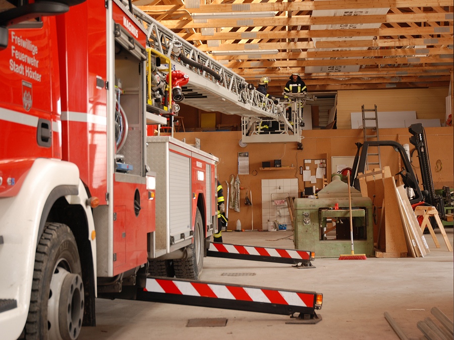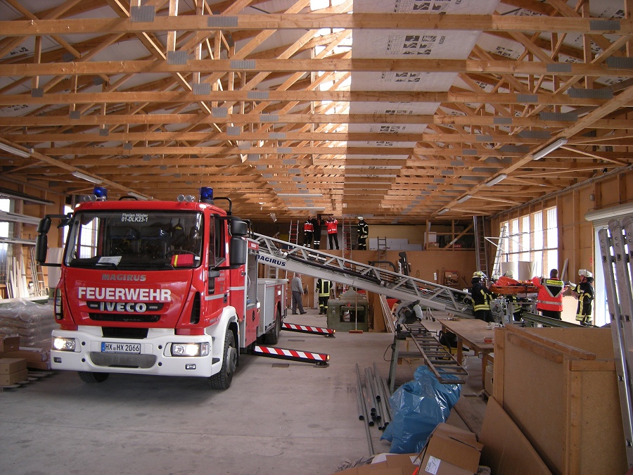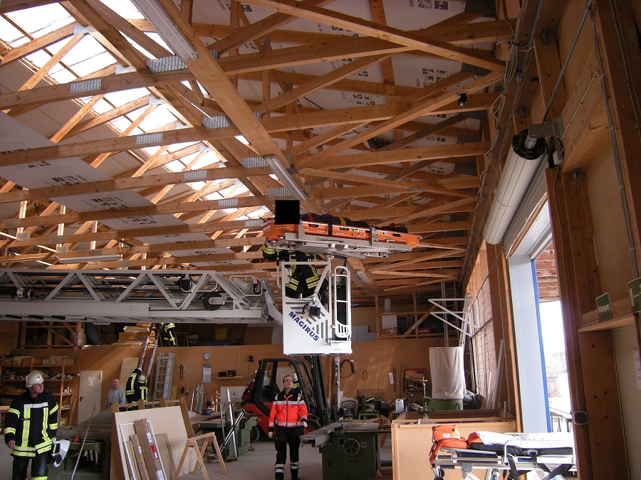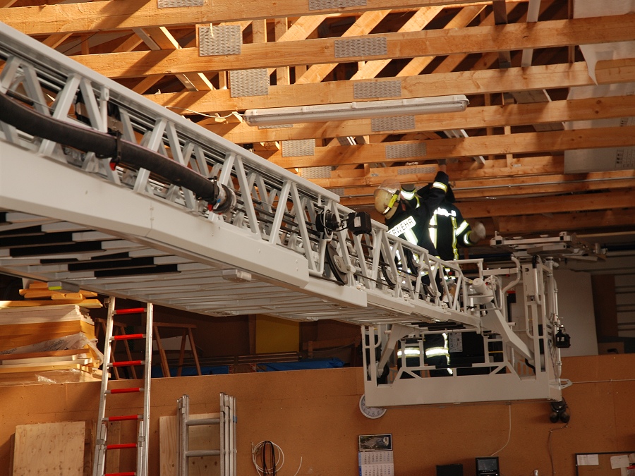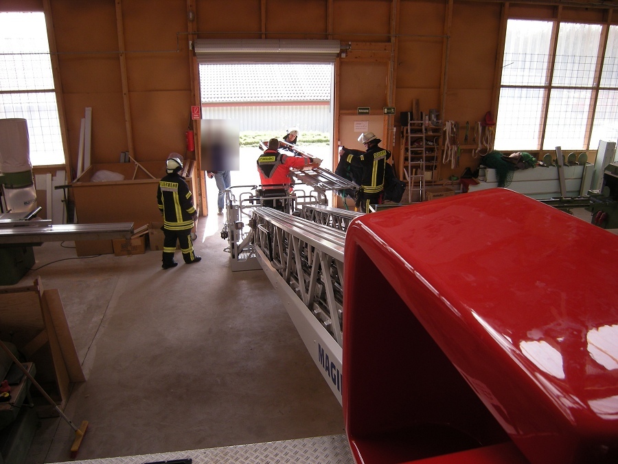 Drehleiter im Gebäude in Stellung gebracht