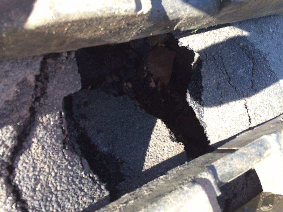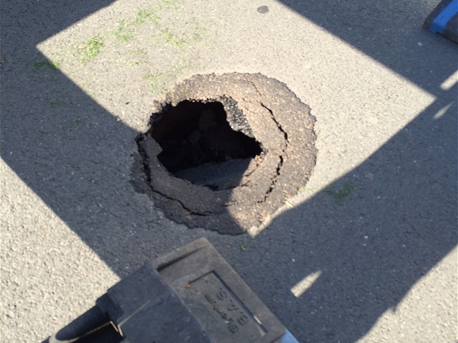 Ca. 70 cm großes Loch in der Teerdecke in der Straße Murrwinkel (unterirdisch mehr als 1,50 Meter ausgehöhlt)