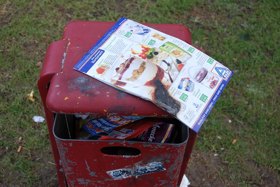 Nach einem späten Hinweis eines Passanten und Durchsuchung eines Mülleimers wurde ein angekokeltes Prospekt gefunden