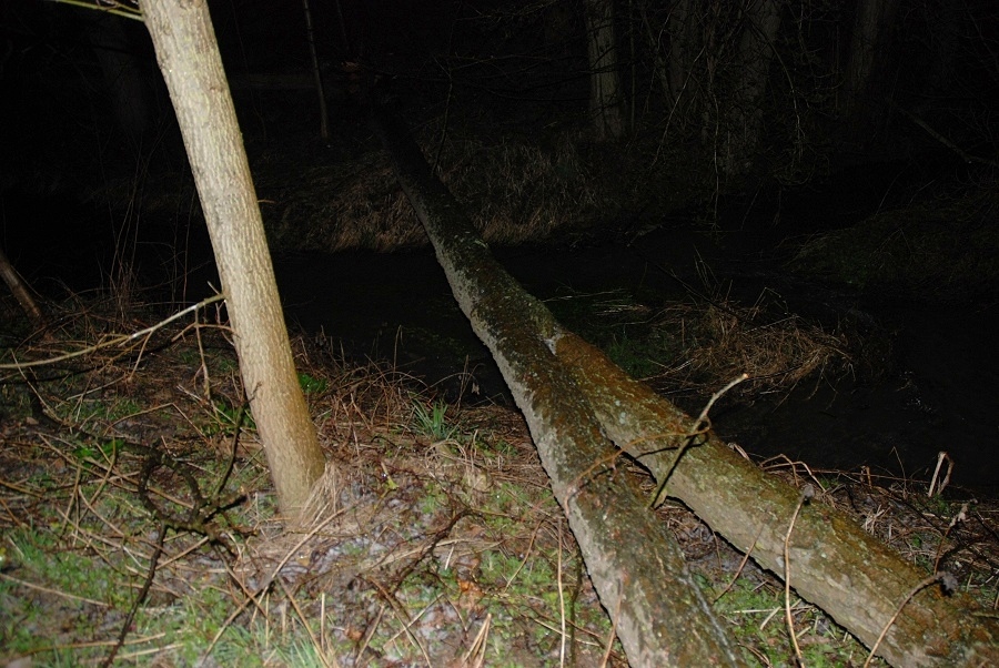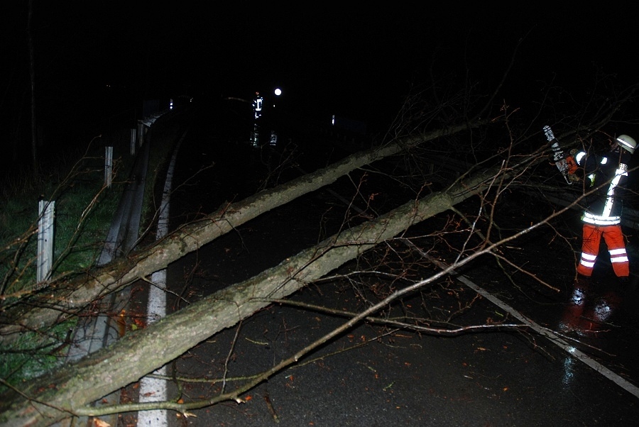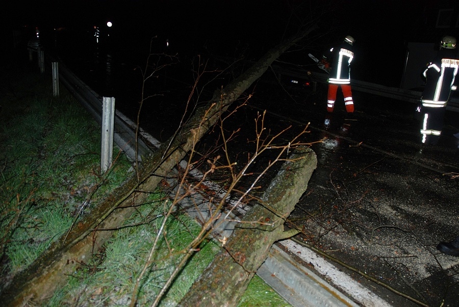 • Umgestürzter Baum ragt in die Fahrbahn hinein