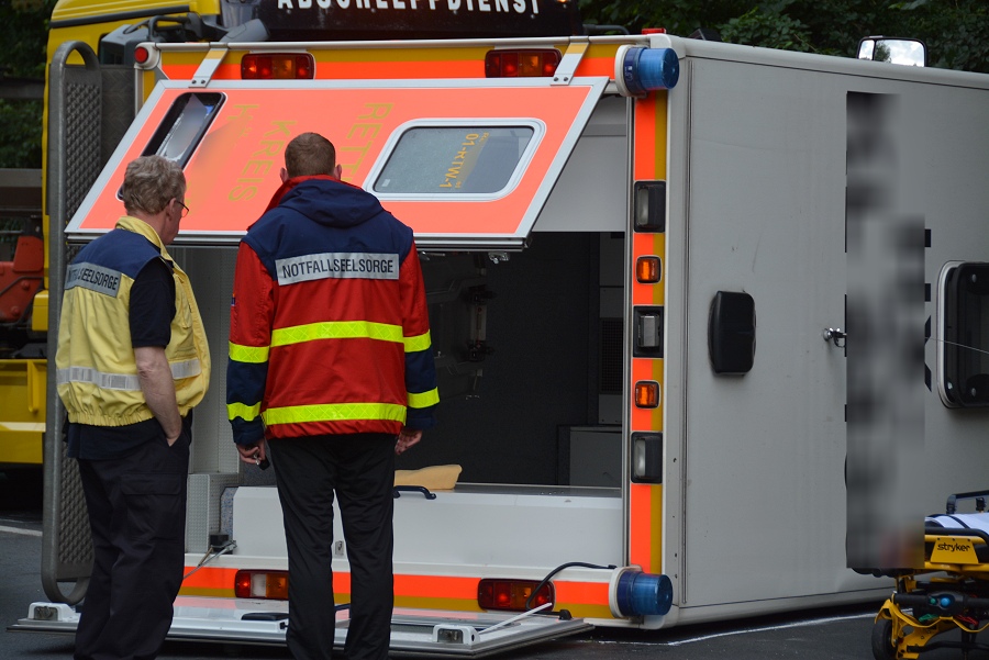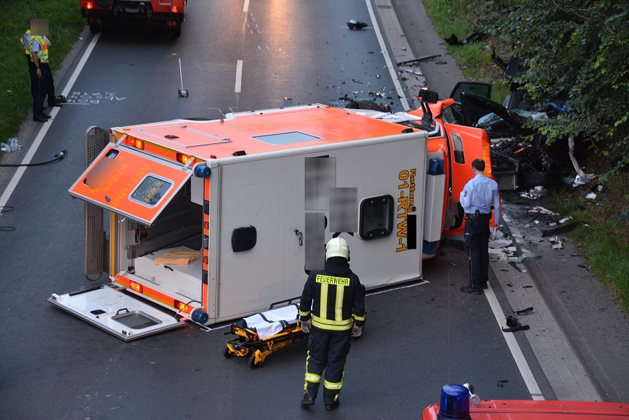 Vier verletzte Personen (Besatzung + Patient) im RTW