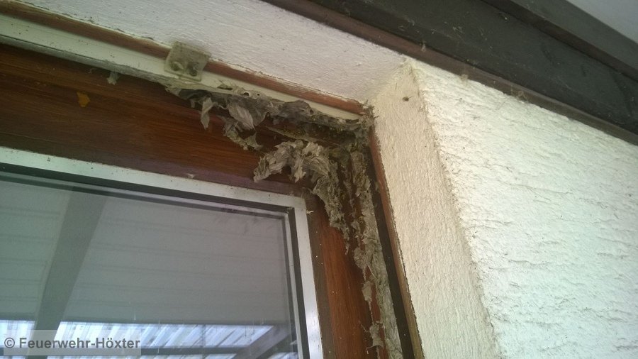 Wespennest in der Ecke eines Fensters (Jalousiekasten)