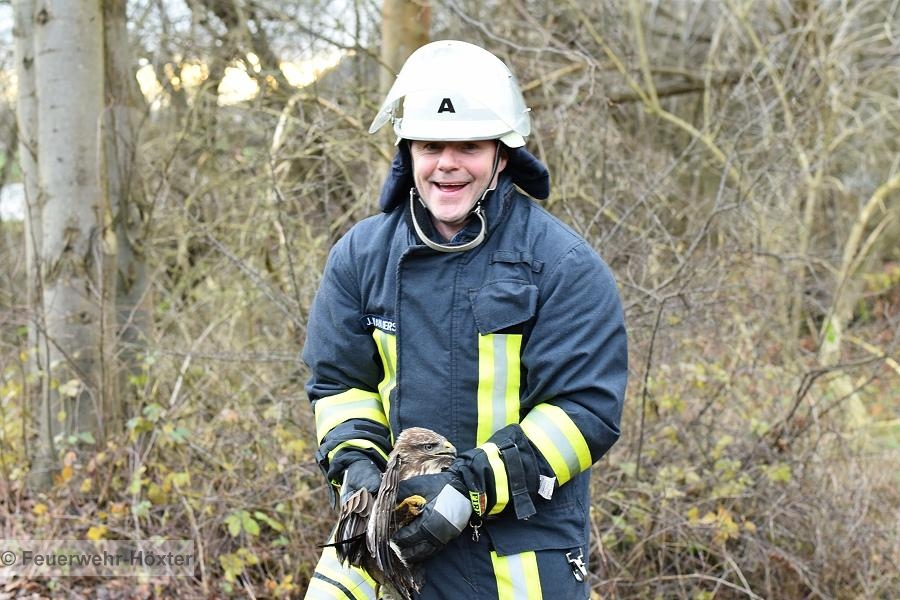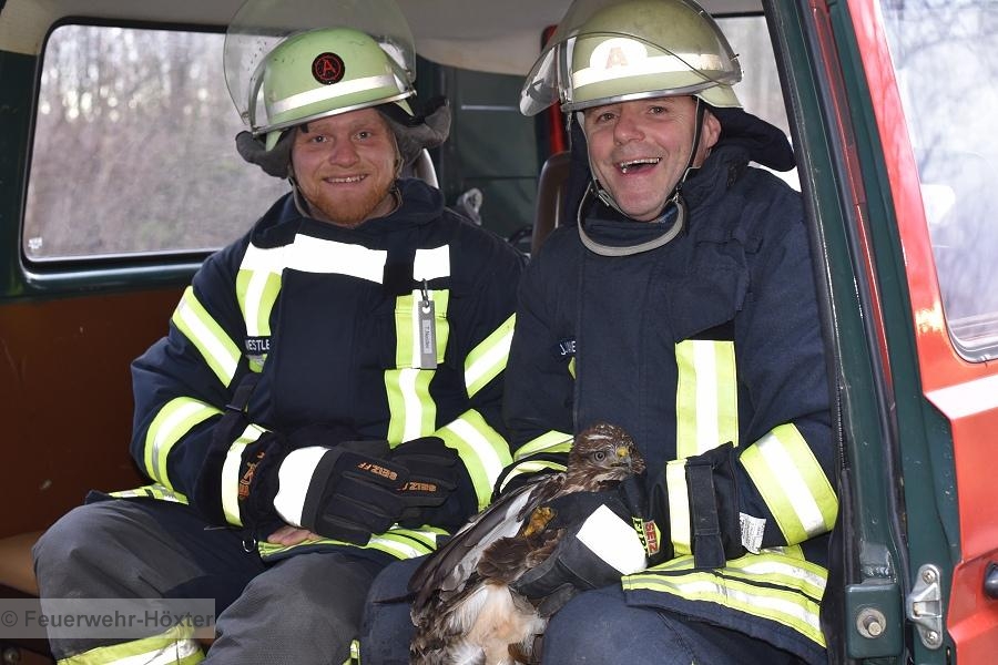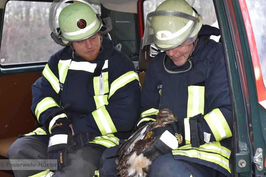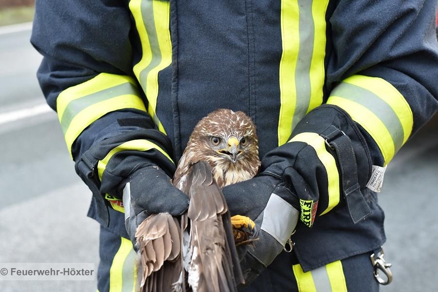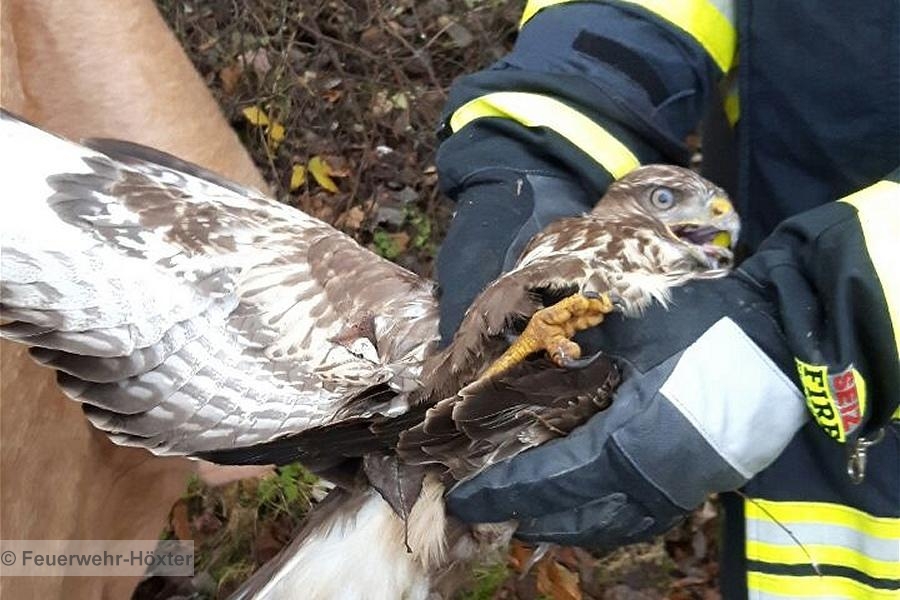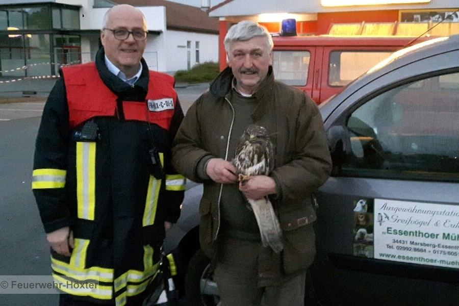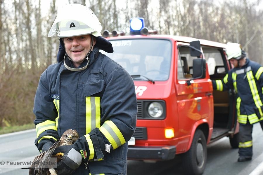Bussard der Aufzuchtstation für Greifvögel Marsberg übergeben auf halber Strecke (Feuerwehr hat den Bussard den Fachleuten von Marsberg entgegen gebracht)