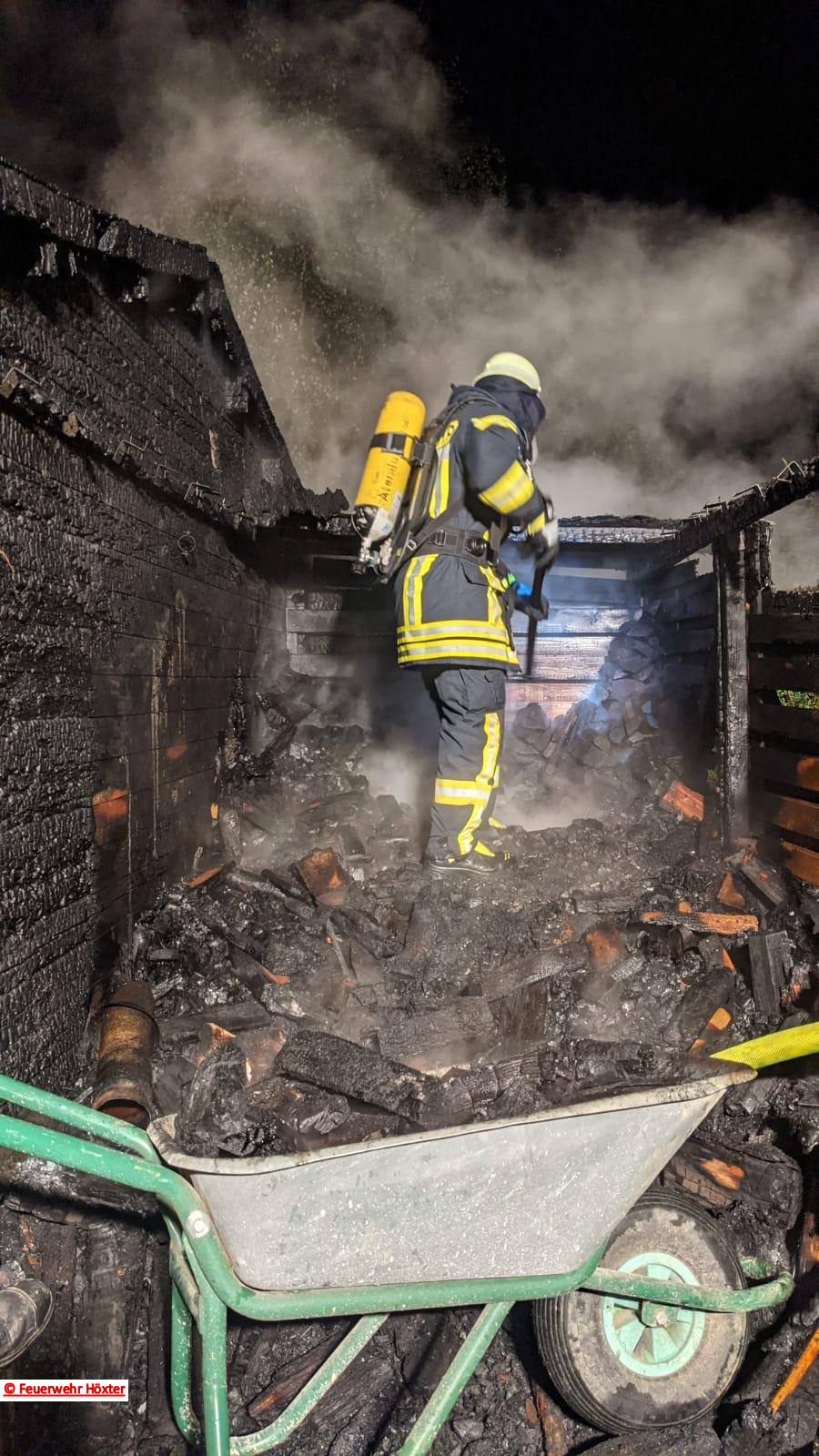 • Brand einer Gartenhütte mit Holzunterstand und anliegender Lebensbaumhecke