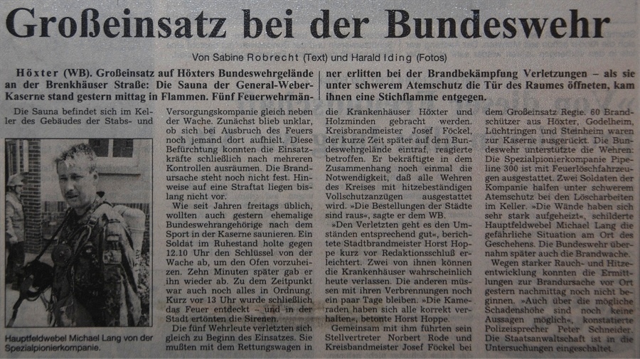 Am Freitag, den 08. August 1997 gegen 13.00 Uhr wird der Löschzug Höxter zu einem Schwelbrand  in einer Sauna der Bundeswehr gerufen. Wie schon seit Jahren freitags üblich wollten ehemalige Bundeswehrangehörige nach dem Sport in der Kaserne saunieren. Ein Soldat im Ruhestand holte gegen 12.10 Uhr den Schlüssel ab, um den Ofen schon mal anzuheizen. Zehn Minuten später gab er ihn wieder zurück. Zu diesem Zeitpunkt war noch alles in Ordnung. Das Feuer wurde kurz vor 13.00 Uhr entdeckt.