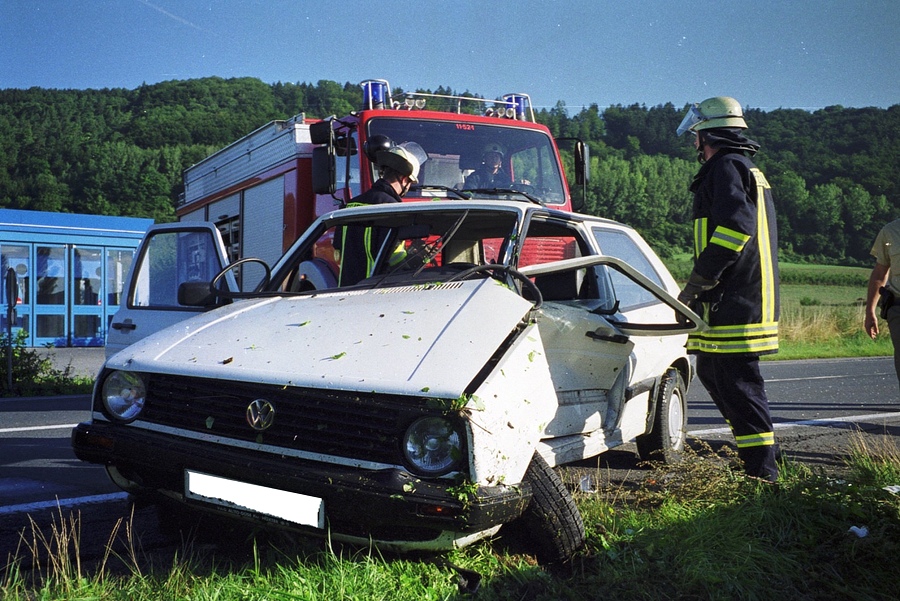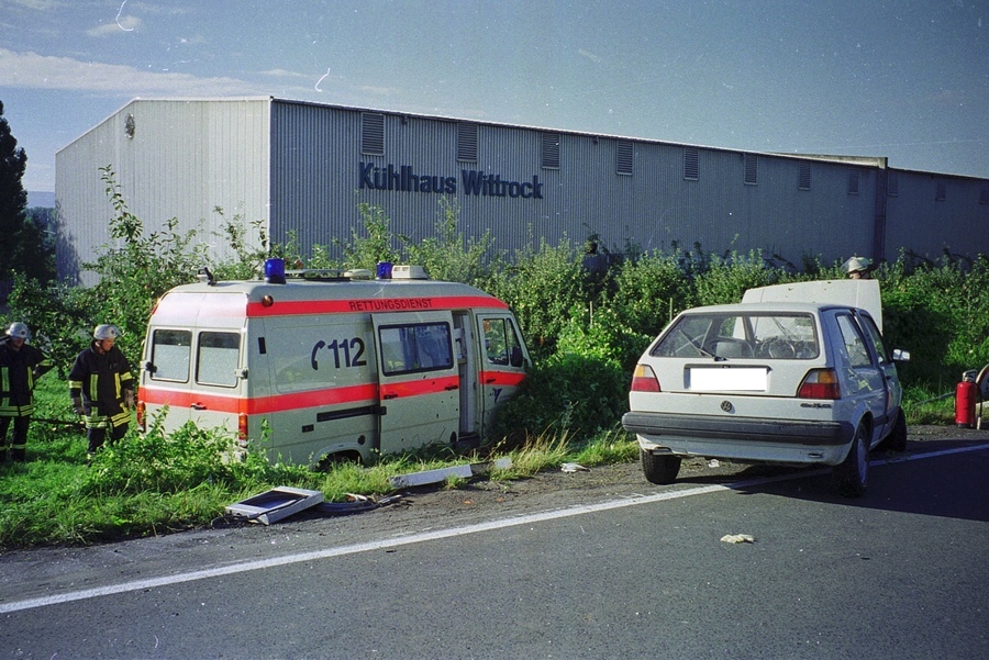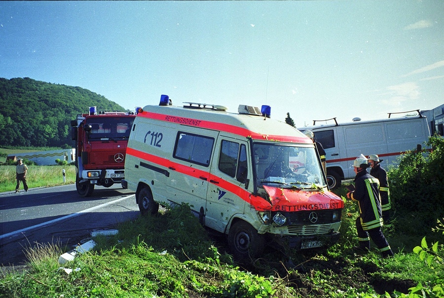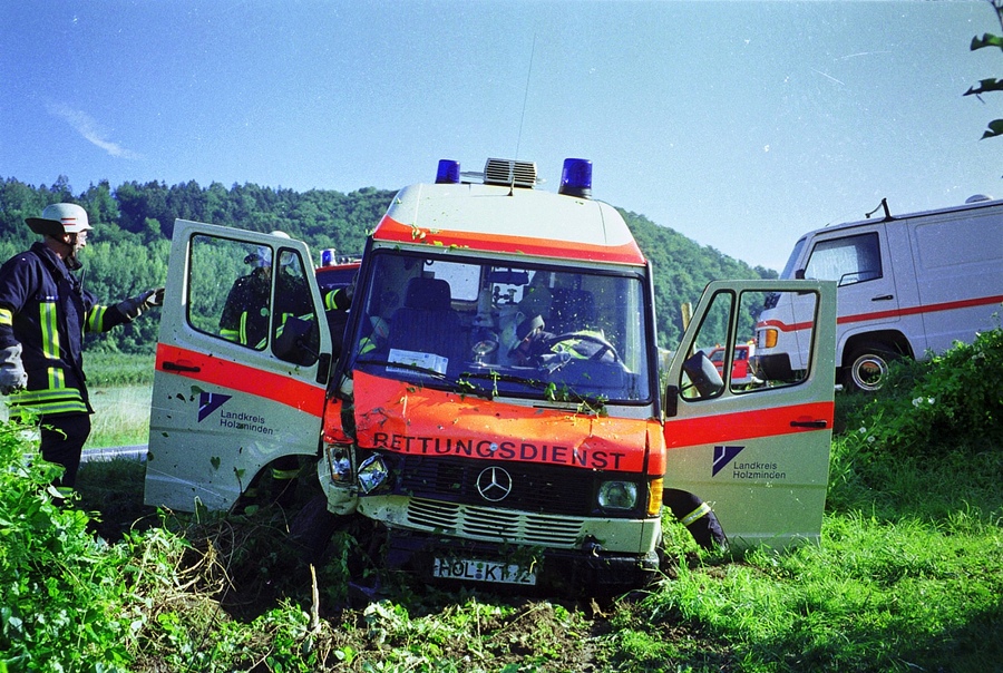Vier Personen wurden am 08. August 1999 bei einem Zusammenstoß zwischen einem Rettungswagen und einem VW Golf auf der Bundesstraße 64/83 bei Höxter schwer verletzt. Der Rettungswagen aus der Nachbarstadt Holzminden war mit einem 74-jährigen Patienten auf der Bundesstraße 64/83 unterwegs. Am Ortseingang Höxter überholte er mit eingeschaltetem Blaulicht und Martinshorn eine Fahrzeugschlange. In der Höhe eines Autohauses wollte der Golf ausscheren, um auf das Grundstück des Autohauses abzubiegen.