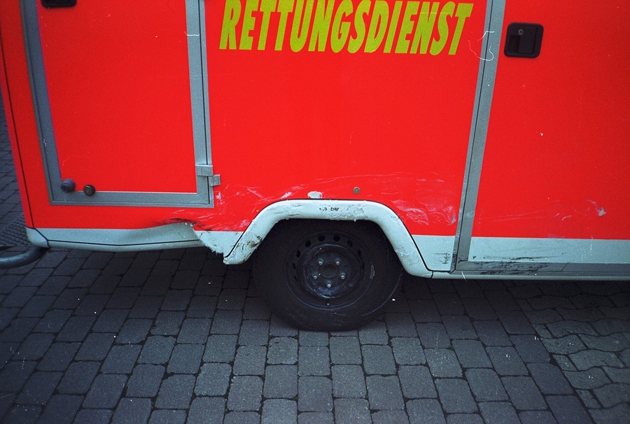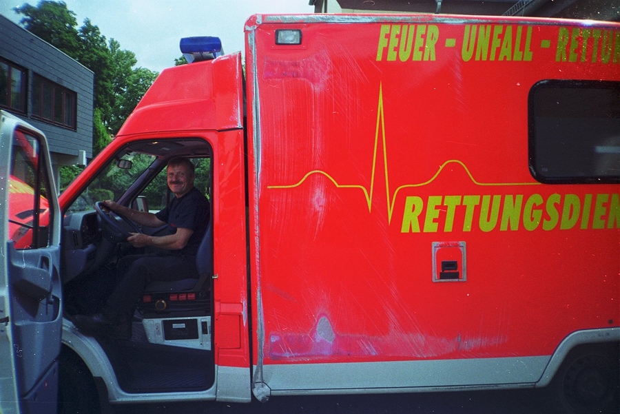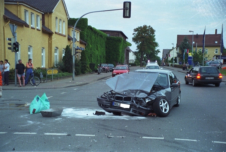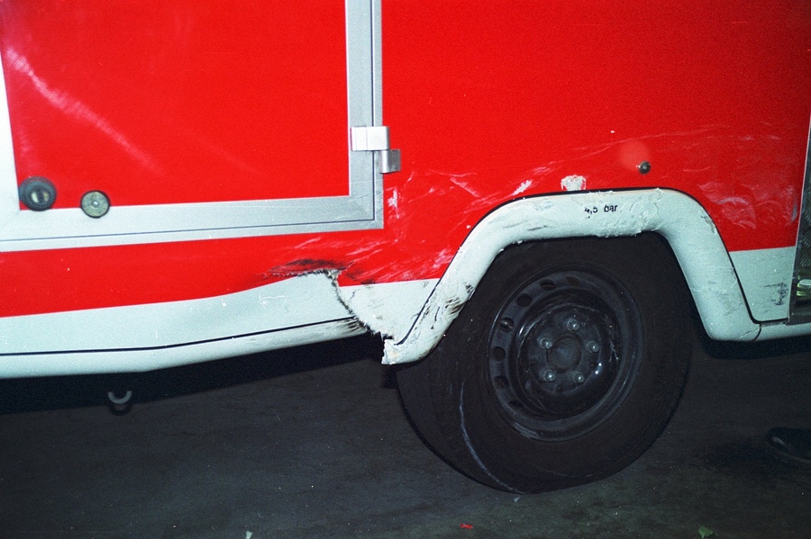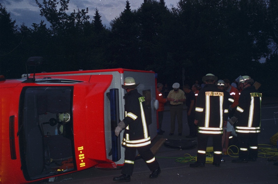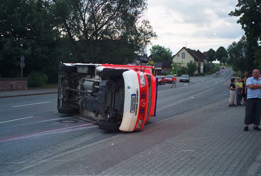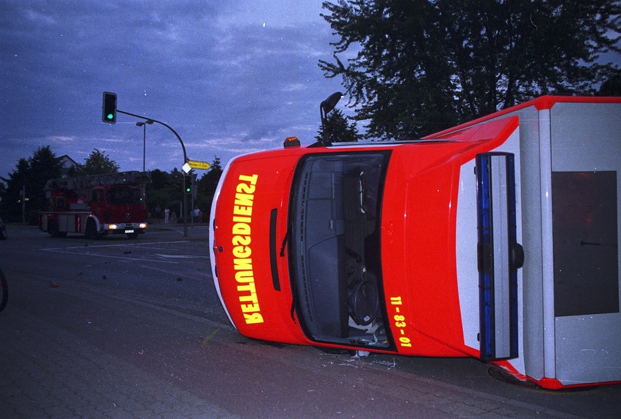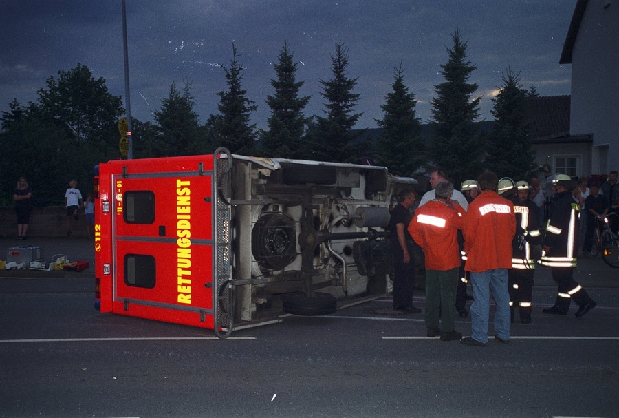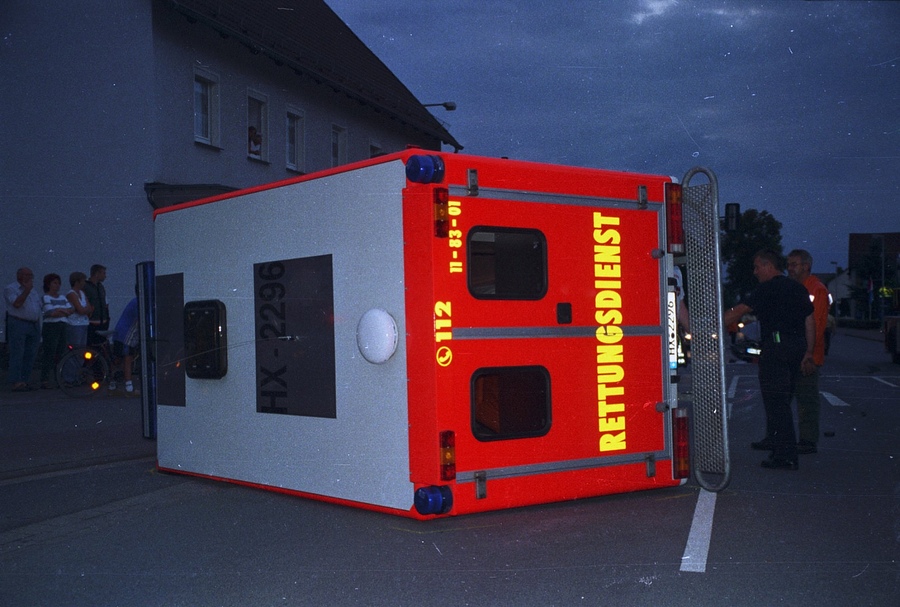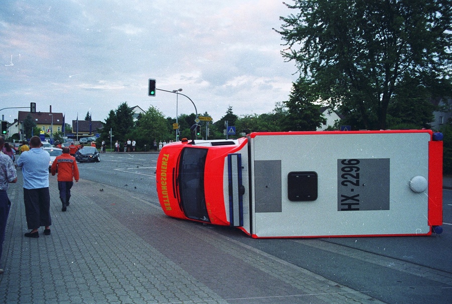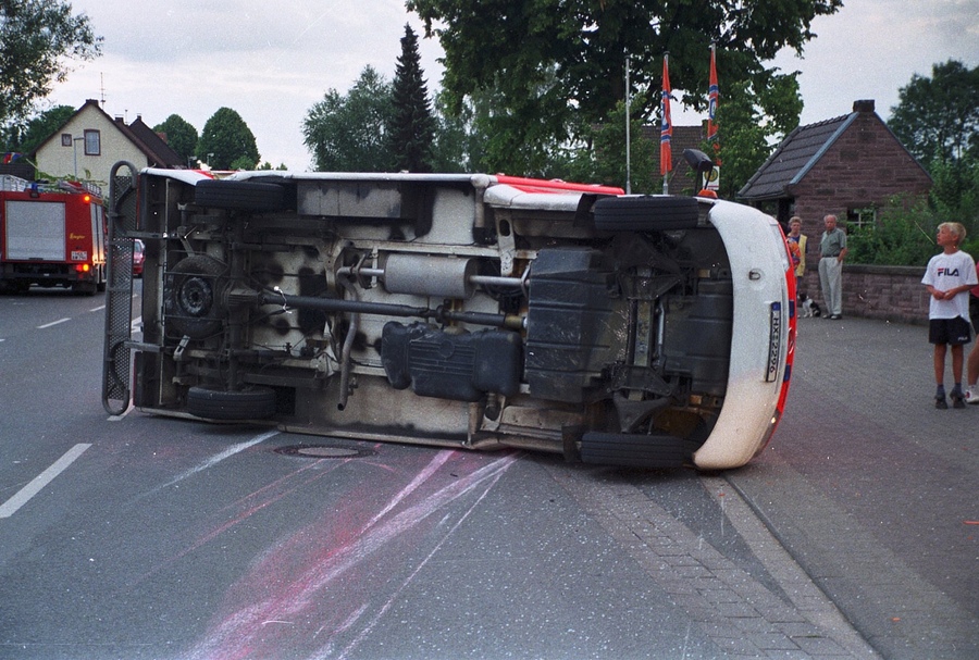Etwa zeitgleich näherte sich ein BMW, der weder Blaulicht noch Martinshorn wahrnahm und mit unverminderter Geschwindigkeit auf die Kreuzung zufuhr. Dann die Schrecksekunde: Im letzten Moment erkannte er die Situation und trat voll auf die Bremse. Zu spät: Der BMW krachte dem RTW voll in die rechte Seite, dieser wurde durch die Wucht des Aufpralls um 90° versetzt, stürzte um und rutschte ca. 16 Meter weit die Strasse entlang. Glücklicherweise wurden der 28jährige BMW-Fahrer und die RTW-Besatzung nur leicht verletzt. Im Kofferaufbau des Rettungswagen blieben alle Teile an ihrem Platz, auch die Trage riss nicht aus ihrer Verankerung. Mit Hilfe der Feuerwehr Höxter konnte der RTW wieder aufgerichtet werden. Der Schaden belief sich auf über 100.000 Mark.