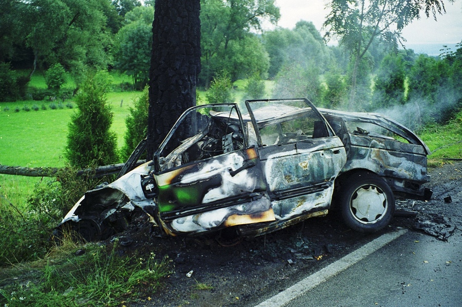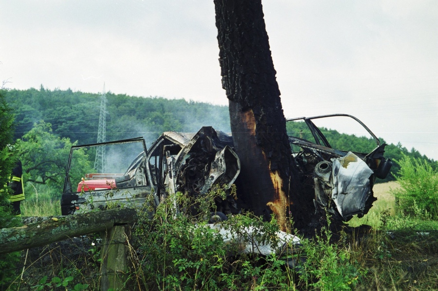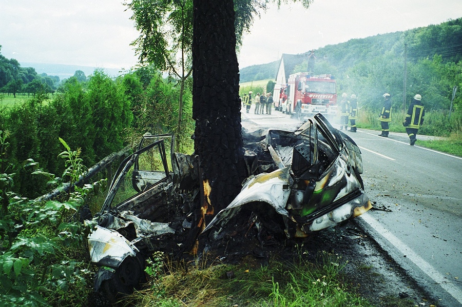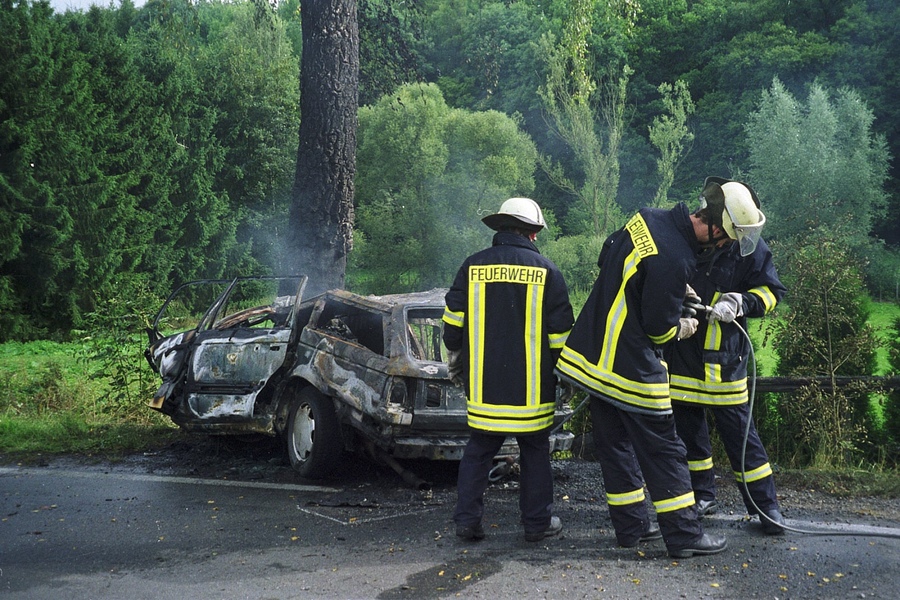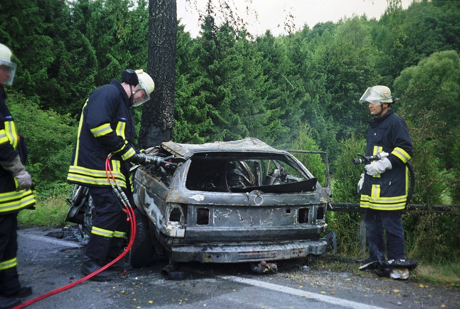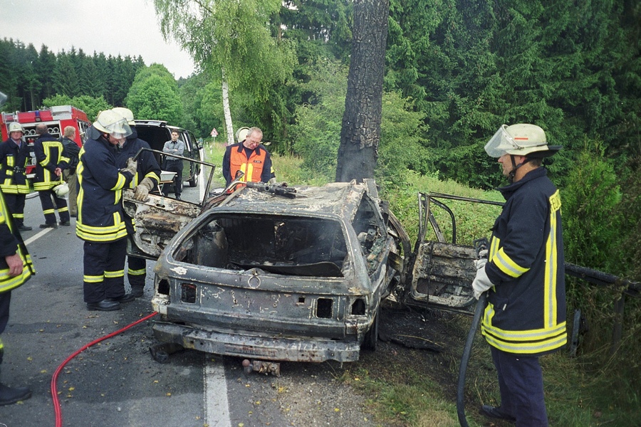 Doch die beiden Männer konnten dem Autofahrer nicht mehr helfen. "Das Feuer war einfach zu groß, selbst die Birke brannte!" Beim Eintreffen der ersten Rettungskräfte stand der PKW bereits im Vollbrand. Die Löschgruppe Albaxen traf nach dem Rettungsdienst als zweites am Einsatzort ein. Da die Löschgruppe zu diesem Zeitpunkt nur ein TSF besaß, unternahmen die Feuerwehrleute die ersten Löschmaßnahmen mit einer Kübelspritze. Die Hitzestrahlung war jedoch so groß, dass man nicht sehr nah an den PKW herangehen konnte. Kräfte des Löschzuges Höxter brachten Brand schließlich rasch mit Hilfe eines S-Rohres unter Kontrolle. Nachdem das Feuer gelöscht war, und die Polizei alles aufgenommen hatte, konnte die Person mit Hilfe von Schere und Spreizer geborgen werden.