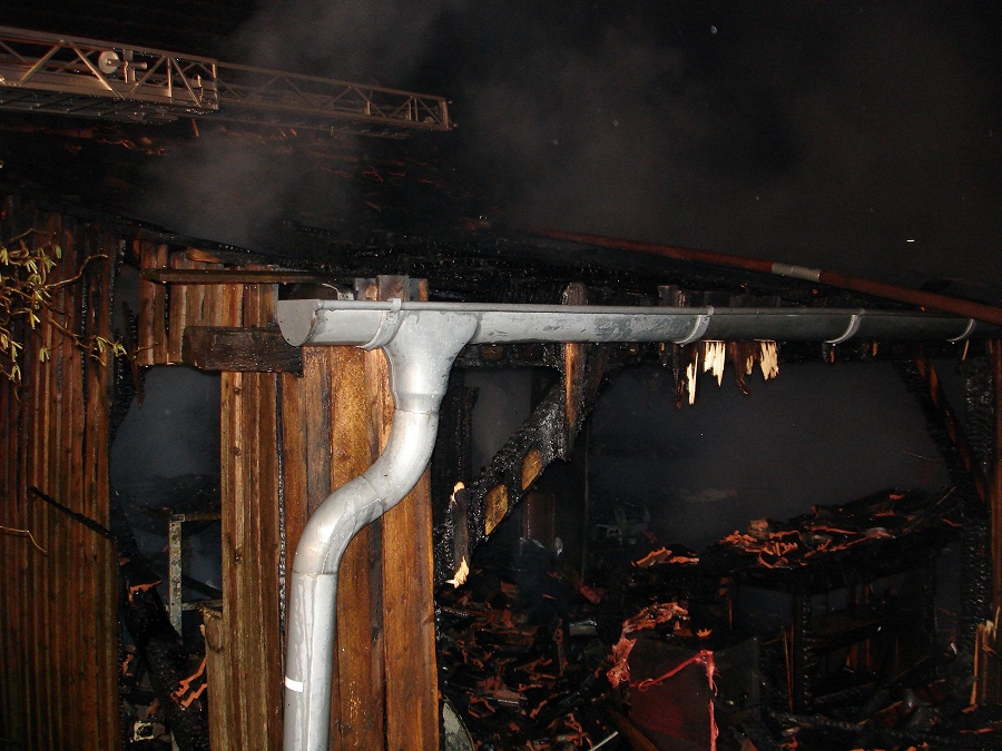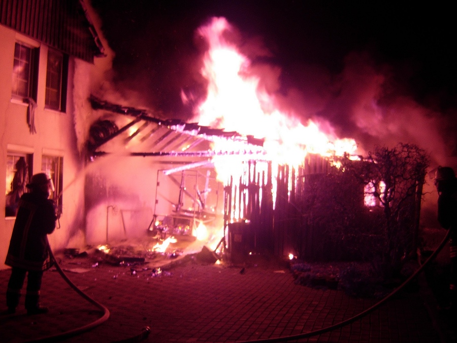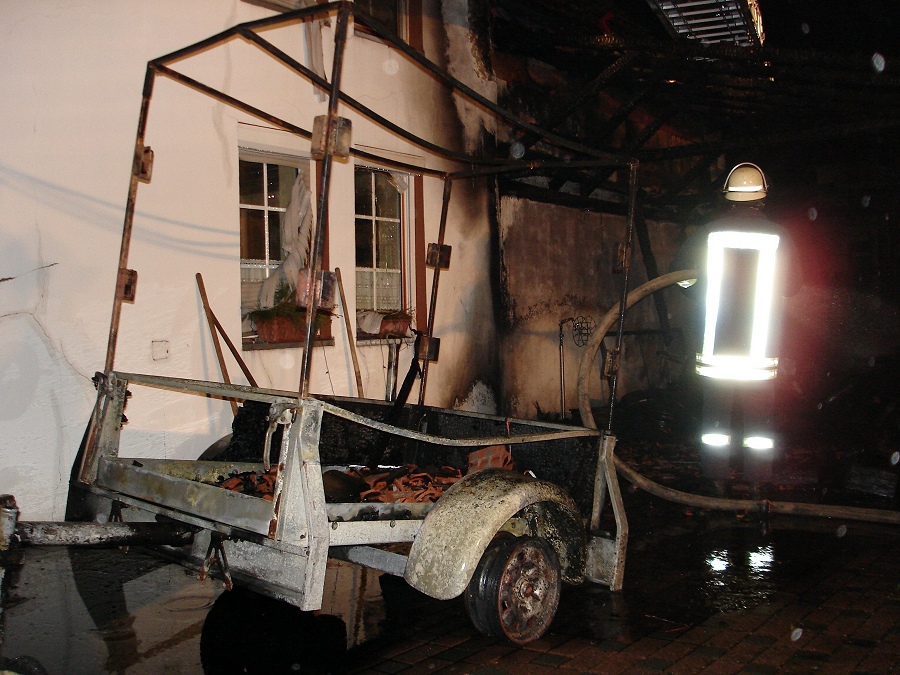 Die 39-jährige Mutter, ihr Mann und ihre zwei Söhne (11 und 14 Jahre) konnten sich daraufhin noch rechtzeitig in Sicherheit bringen. Die alarmierten Einsatzkräfte der Löschgruppen Bruchhausen, Ottbergen und Godelheim waren schnell zur Stelle und nahmen zur Brandbekämpfung umgehend mehrere C-Rohre vor. Nur durch den schnellen Einsatz der Feuerwehrleute konnte ein Übergreifen der Flammen auf das angrenzende Wohnhaus verhindert werden. Glutnester, aber auch noch offene Flammen am Dach des Hauses wurden auch über die Höxteraner Drehleiter mit einem C-Rohr bekämpft. Anschließend wurde über die Drehleiter nochmal genau das Dach des Wohnhauses mit Hilfe einer Wärmebildkamera kontrolliert, um versteckte Glutnester aufzuspüren. Die Nachlöscharbeiten zogen sich noch bis kurz nach 8.00 Uhr hin. Insgesamt wurden laut Einsatzleiter Stefan Dickel fünf C-Rohre vorgenommen. Es waren 55 Feuerwehrleute mit zehn Fahrzeugen aus Bruchhausen, Godelheim, Höxter und Ottbergen im Einsatz.