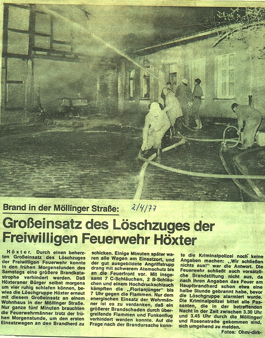 In der Möllinger Strasse brannte am 02. April 1977 gegen 04.00 Uhr ein Lagerraum mit angrenzendem Wohnhaus. Als das erste Fahrzeug des Löschzuges Höxter an der Einsatzstelle eintraf, brannte der Lagerraum in voller Ausdehnung. Durch die Wärmestrahlung wurden die Fenster des angrenzenden Wohngebäudes zerstört. Das Feuer griff danach auch auf drei Wohnräume im ersten und zweiten Obergeschoss über. Menschen waren zu diesem Zeitpunkt nicht mehr in Gefahr.